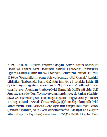Her kitabında şaşırtıcı konuları işleyen Ahmet Yıldız, uzun bir aradan sonra yine bambaşka öykülerle okurun karşısına çıkıyor. Borges, Umberto Eco, Amin Maalouf ya da Calvino’nun tarihle beslediği yazınsal tad, bu öykülerde, Türkçenin olanaklarıyla bize özgü bir sentez oluşturuyor. Yakın ya da uzak tarih, geçmiş ya da şimdiki zaman ayrımı yapılmadan insanın yaşadığı her trajedi kayda geçiriliyor ve okura sonsuz dünyalar sunuluyor. Sert, hüzünlü ama derin düşünceler yaratan, oldukça şaşırtıcı, bir o kadar da sürükleyici öyküler insanoğlunun ölüm karşısında kaldığı çaresizliğe isyanı anlatırken, her edebiyat metninin birer tarih meni olduğunu da savlıyor.